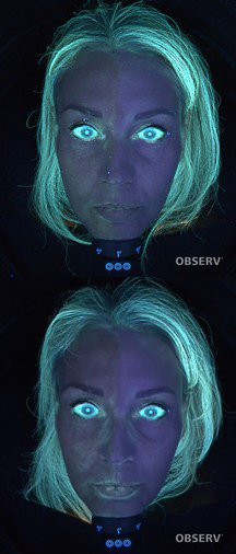 Op de eerste foto is het product net aangebracht. De rechterkant is beter beschermd (dat is te zien doordat deze een donkerdere kleur uit slaat). Wat verder nog opvalt is dat het product op de tweede foto aan de linkerkant is uitgelopen (het stuk op de wang is een stuk lichter). En dit is nog maar na 2 uur!