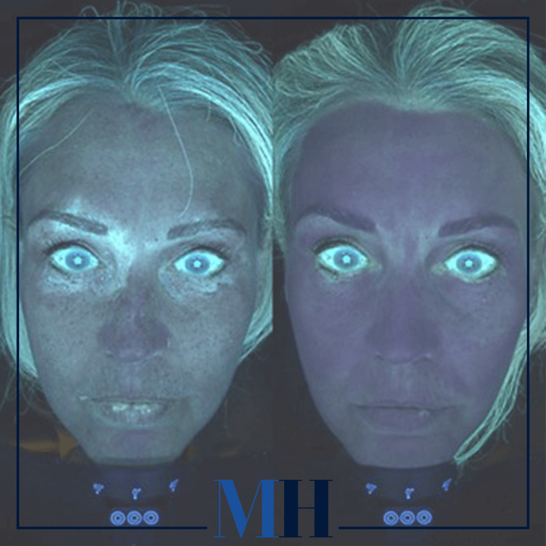 De foto’s zijn gemaakt met onze huidscan, de Observ 520x, en laat zien hoe goed de huid beschermd is tegen schadelijke UV-straling. Hoe donkerder, of hoe meer paars de huid uitslaat, des te beter de huid beschermd is tegen de zon.